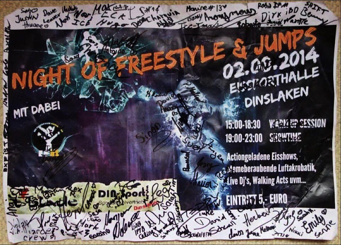 Die Eishalle in Dinslaken gehört zu den wenigen Einrichtungen, die Freestyle nicht nur akzeptieren, sondern aktiv fördern. Jedes Jahr findet hier die „Night of Freestyle & Jumps“ statt, bei dem verschiedene nationale und internationale Teams ihr beeindruckendes Können präsentieren. Die Veranstaltung, die 2014 ins Leben gerufen wurde, wird von der Eissporthalle Dinslaken und vielen Ehrenamtlichen Helfern organisiert und durchgeführt.